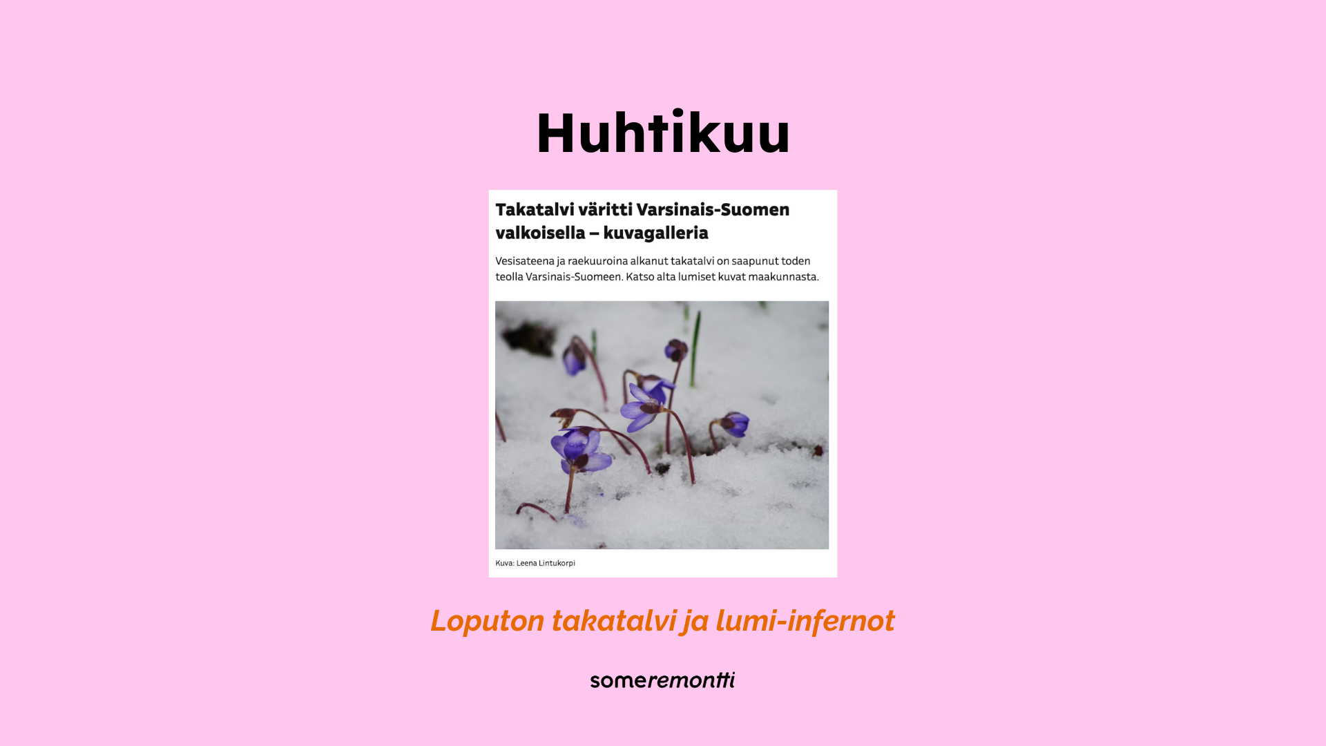 Suomen monet takatalvet tuskin tulevat enää yllätyksenä kenellekkään, mutta nyt ennätyksellisen myöhään huhtikuun loppupuolella tullut lumi-inferno sai somenkin sekaisin. Lisäksi ns. klassikkovideoksi ristitty Pekka Poudan kevätkeleille naureskeleva video kaivettiin taas arkistoista esiin.